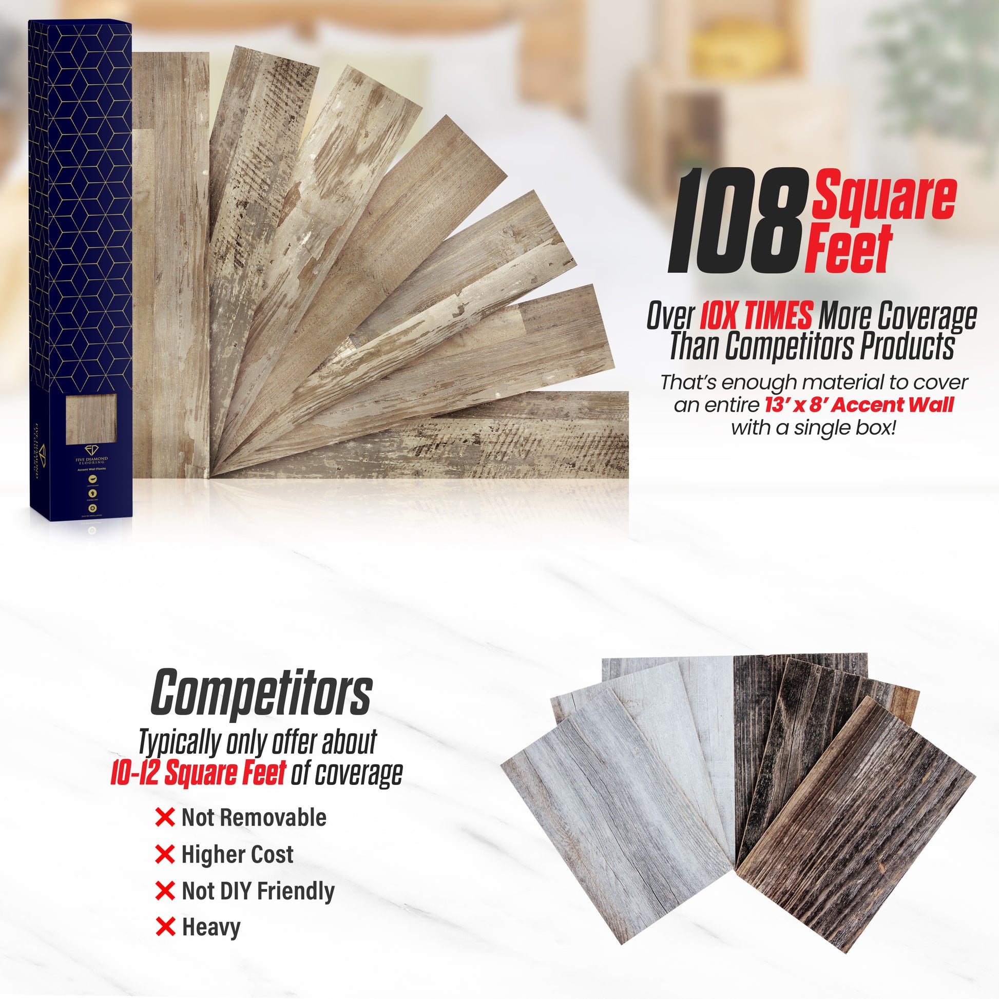 Accent Wall Planks by Five Diamond Flooring are an excellent way to bring a sense of modern sophistication to any room in your home! Super easy peel and stick installation, with strong grip strength. And best of all, simply heat them up with a hair dryer if you want to remove them, and they won't damage your walls. 108 Square Feet per box, which is enough material to cover a 13 foot by 8 foot wall with a single box. Accent Wall Planks by Five Diamond are lightweight, making them incredibly easy to cut during installation with just a scissors. New and improved with better adhesive, and a foil backing layer for added stability. With Five Diamond Wall Planks it's Peel...Stick...Done!